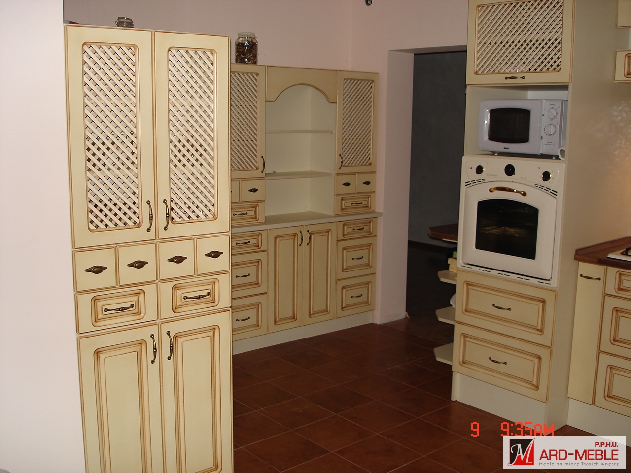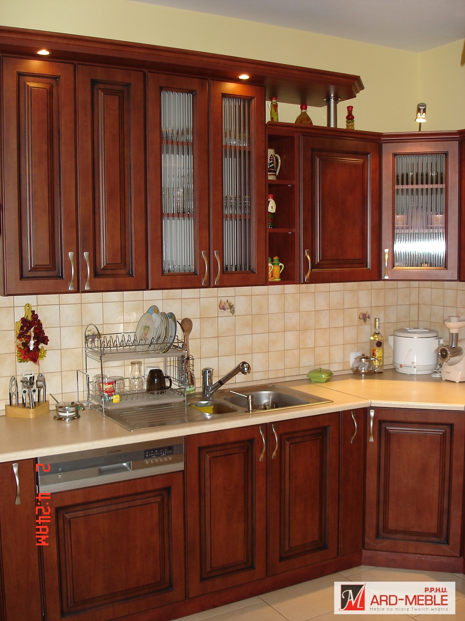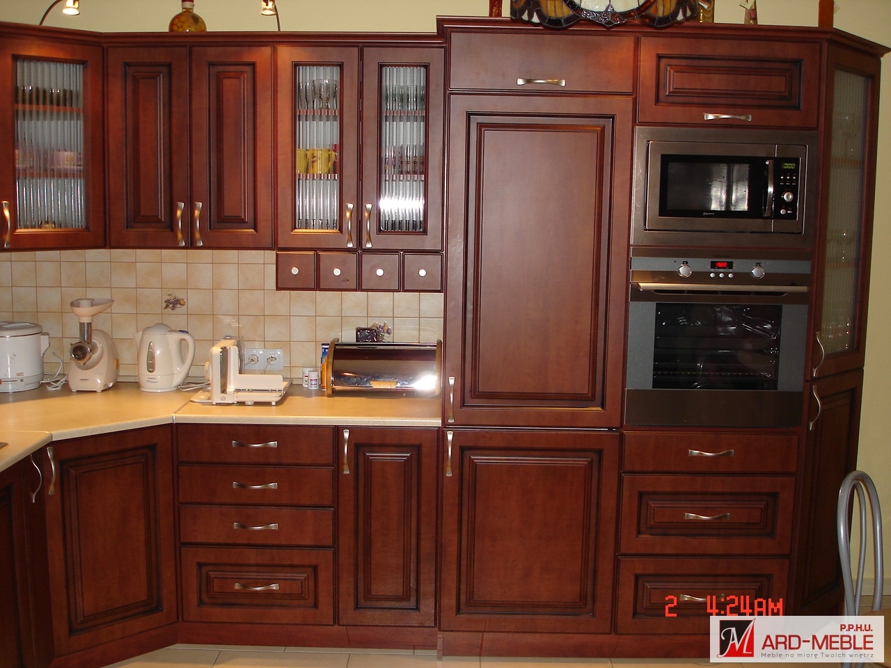 W meblach kuchennych rustykalnych natomiast dominującym materiałem jest lite frezowane drewno, które można również zastąpić frezowanym MDF foliowanym, lakierowanym lub patynowanym uzyskując ten sam charakter mebli. Charakterystycznym elementem tych kuchni są ozdoby w postaci pilastrów, listew wieńczących czy też złotych albo porcelanowych uchwytów. Do tego rodzaju kuchni producenci sprzętu AGD mają w swoich ofertach specjalne urządzenia wzorowane na dawnych, tradycyjnych modelach.